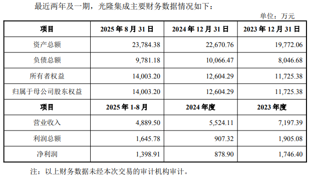 2023年度、2024年度、2025年1至8月,光隆集成营业收入分别为7,197.39万元、5,524.11万元、4,889.50万元,净利润分别为1,746.40万元、878.90万元、1,398.91万元。光隆集成2024年营收同比下降23.25%,净利同比下降49.67%。