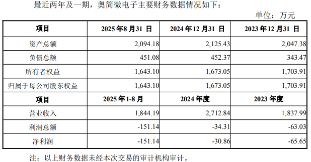 2023年度、2024年度、2025年1至8月,奥简微电子营业收入分别为1,837.99万元、2,712.84万元、1,844.19万元,净利润分别为-65.65万元、-30.86万元、-151.14万元。