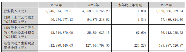 2024年,英唐智控营业收入为53.46亿元,同比增长7.83%;归属于上市公司股东的净利润6027.50万元,同比增长9.84%;归属于上市公司股东的扣除非经常性损益的净利润4254.44万元,同比增长67.60%;经营活动产生的现金流量净额4.13亿元,同比增长224.22%。