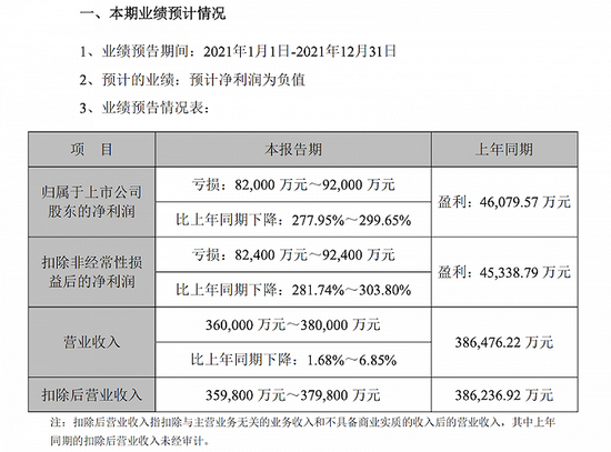 1月25日晚间,青松股份发2021年业绩预告。数据显示,青松股份预计2021年实现的营业收入为36亿元到38亿元,同比下降6.85%到1.68%;对应实现的归属上市公司股东的净利润为亏损约8.2亿元到9.2亿元,同比由盈转亏,为上市以来首亏。