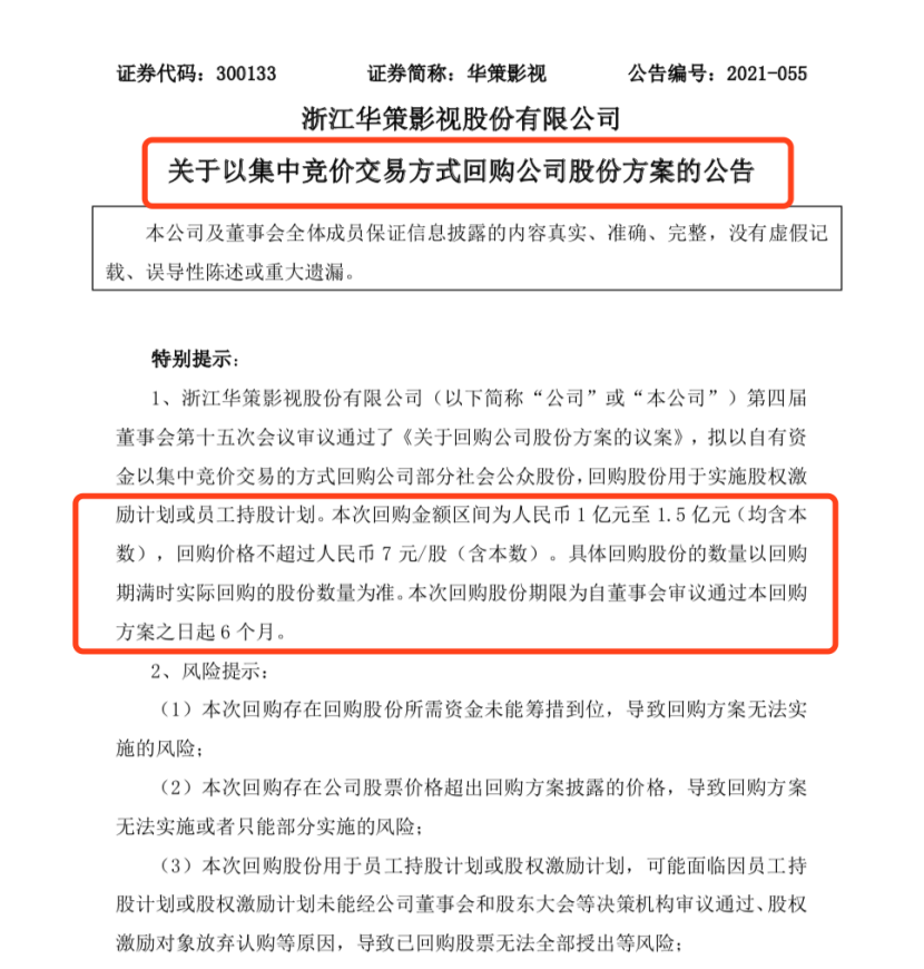截至2021年三季报披露之日(10月28日),华策影视尚未实施本次股份回购方案。公司表示将严格按照前期发布的股份回购计划中的期限、金额、价格等要求,根据市场情况择机实施。