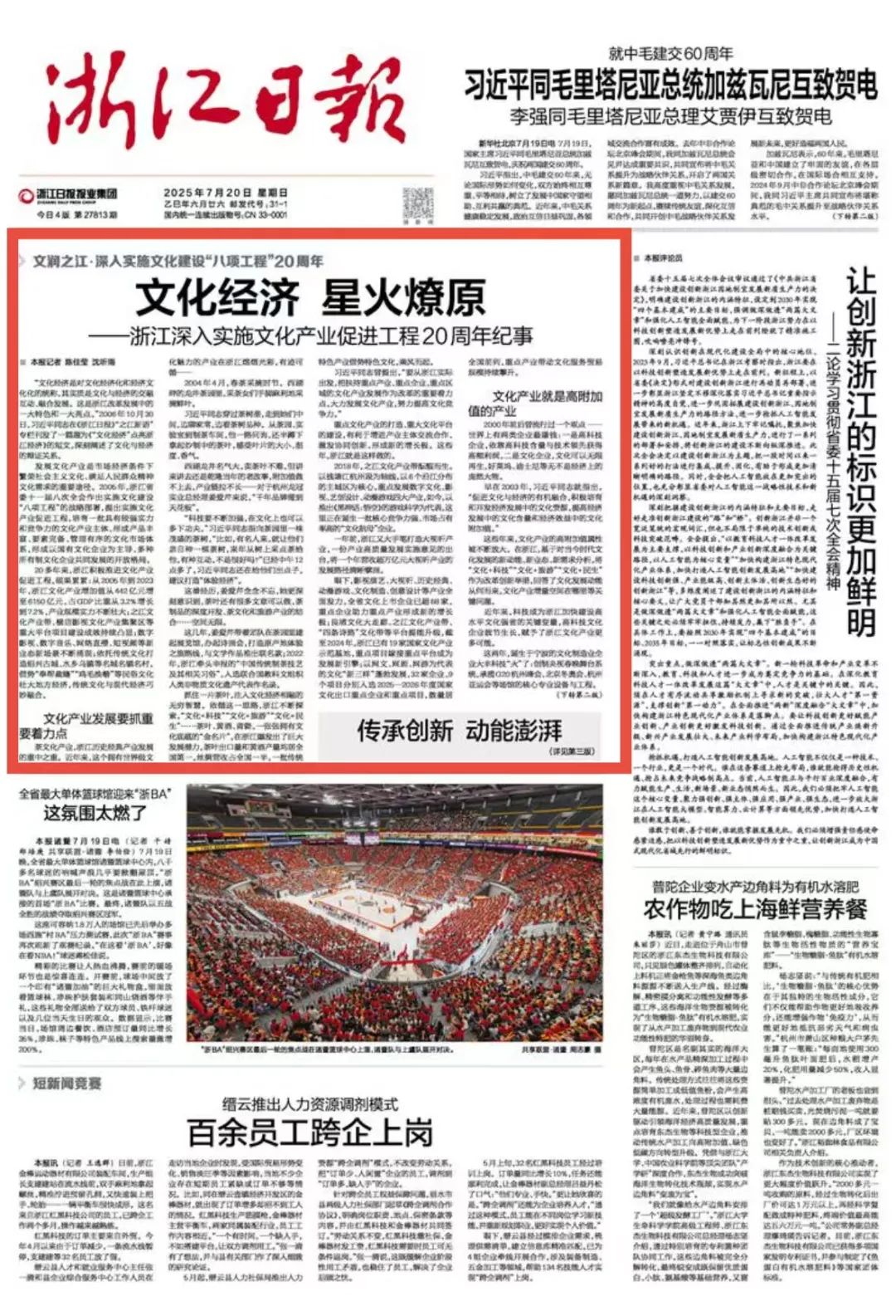 7月20日,浙江日报头版头条刊登《文润之江丨文化经济星火燎原——浙江深入实施文化产业促进工程20年纪事》,将华策影视作为浙江文化建设“八项工程”实施20年的民营企业代表进行报道。