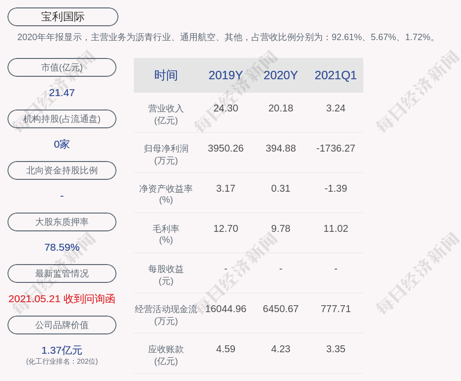 2020年年报显示,宝利国际的主营业务为沥青行业、通用航空、其他,占营收比例分别为:92.61%、5.67%、1.72%。