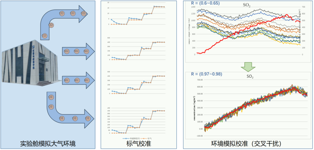 将多种传感器的数据综合分析计算用来得到SO2的气体浓度。现场测试设备经历了实验舱模拟大气环境实验-标气校准-环境模拟校准(交叉干扰)等工艺步骤,有效减轻气体交叉干扰。