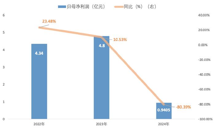 根据晨光生物同日公布的最新年报,2024年全年,晨光生物呈现出增收不增利趋势,营业收入同比微增1.79%至69.94亿元,归母净利润则较上年同期大跌80.39%,跌破亿元规模,仅录得9404.96万元。