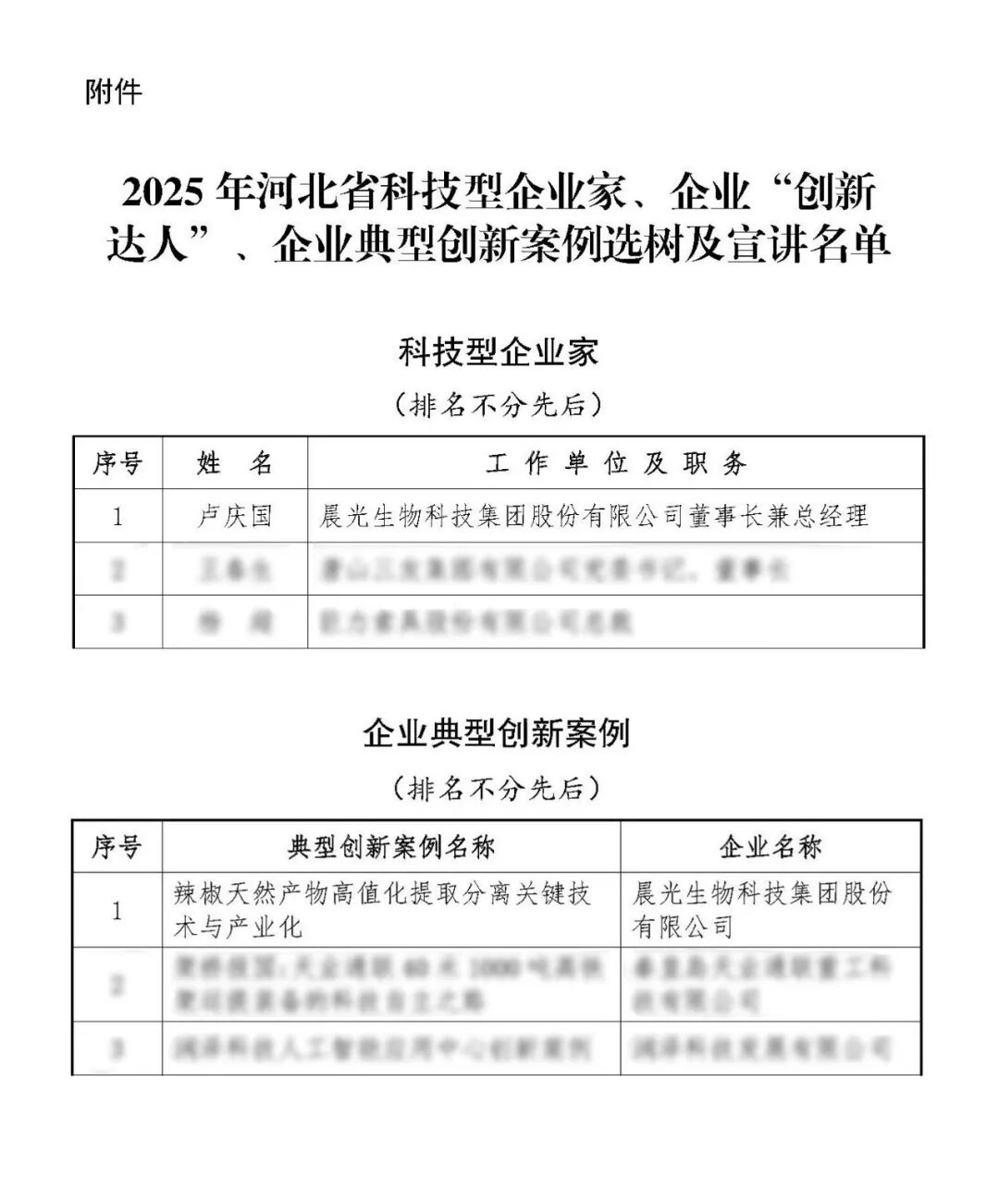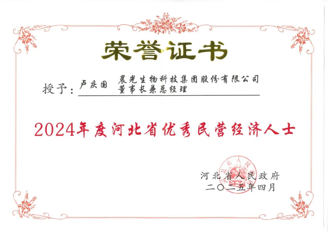 ▼4月24日,河北省人民政府授予晨光生物“2024年度河北省优秀民营企业”、授予董事长卢庆国“2024年度河北省优秀民营经济人士”荣誉称号。该项荣誉提升了企业品牌公信力,彰显了公司的标杆地位。