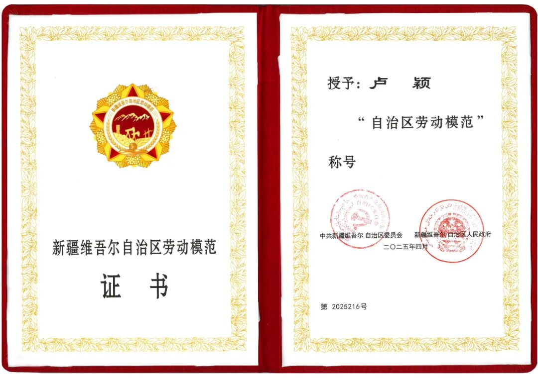 ▼4月30日,新疆劳动模范和先进工作者表彰大会在新疆人民会堂举行,总经理卢颖荣获“自治区劳动模范”荣誉称号。