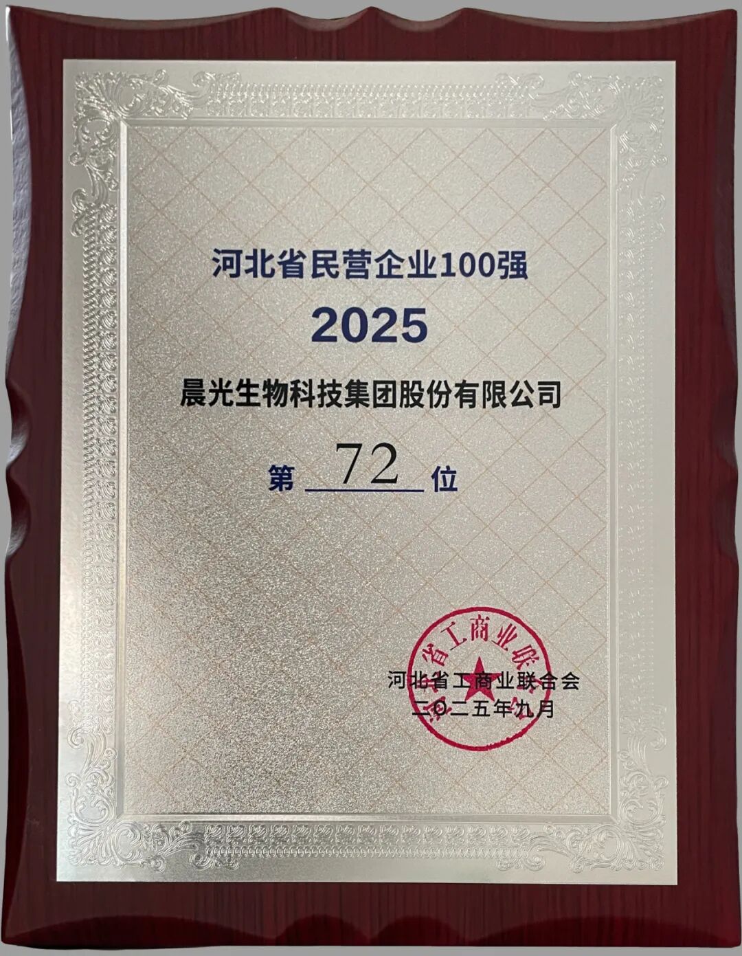 晨光生物荣膺2025河北省民营企业100强第72位、河北省制造业民营企业100强第59位、河北省民营企业研发投入100强第41位、河北省民营企业发明专利100强第8位。