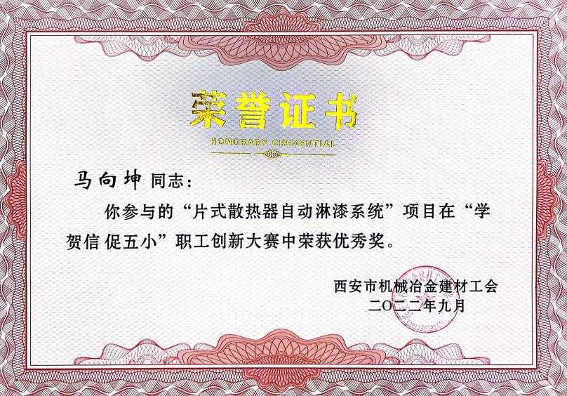 近日,西安市机械冶金建材工会印发了《关于表彰2022年度职工“学贺信、促五小”创新大赛优秀成果和优秀组织单位的通报》,启源装备工会申报的《片式散热器合片自动下料系统(马向坤、张现斌、刘晶)》《片式散热器自动淋漆系统(马向坤、张现斌、张建刚)》分别荣获二等奖和优秀奖。同时,中环装备工会荣获“优秀组织单位”称号。