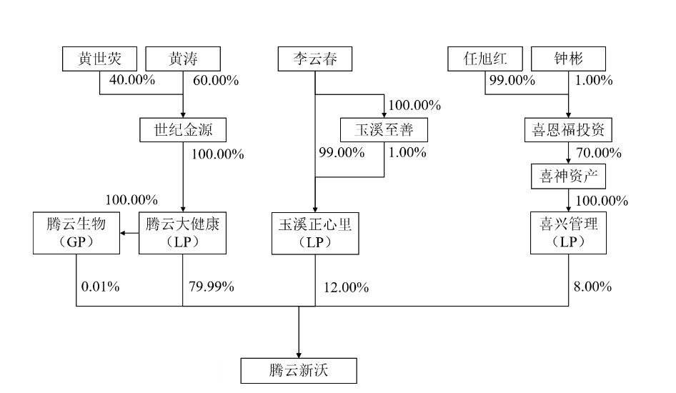 根据公告,即将入驻沃森生物的控股股东腾云新沃成立于2026年2月12日。股权穿透显示,腾云大健康持有腾云生物的100%股份,世纪金源持有腾云大健康的100%股份,自然人黄涛持有世纪金源60%股份,为腾云新沃实际控制人。