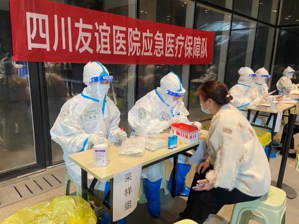 此外,4月4日起,四川友谊医院每日常态化派出4人小队支援锦江区疾控中心,负责风险人群、封控小区核酸采集任务工作。同时,医院常备40人医疗储备,接受疾控中心调配参与风险人群核酸采样任务。
