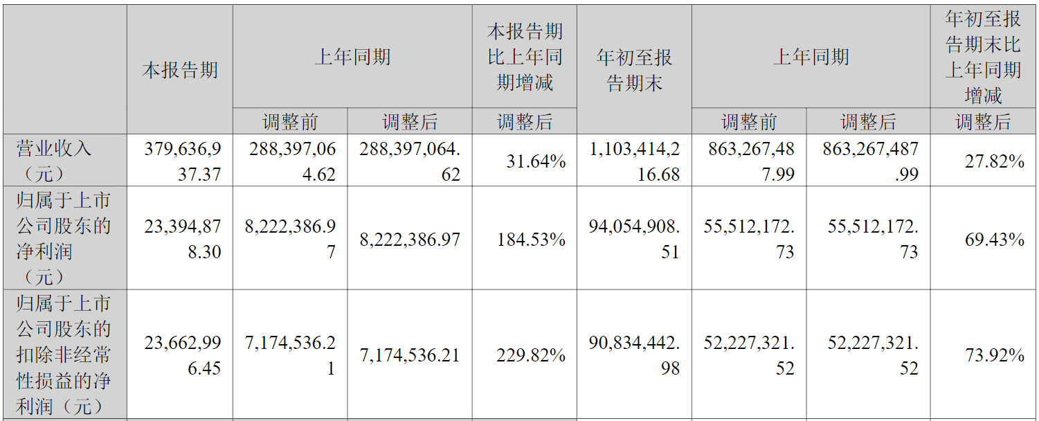 三季报显示,盈康生命在第三季度内实现营业收入3.80亿元,同比增加31.64%,实现归母净利润2339.49亿元,同比增加184.53%;今年前三季度,盈康生命实现11.03亿元,同比增加27.82%,实现归母净利润9405.49万元,同比增加69.43%。