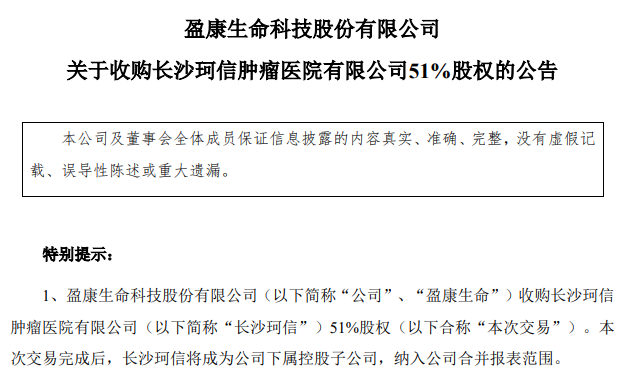 2025年3月31日,盈康生命宣布以3.57亿元收购长沙珂信肿瘤医院51%股权,5月底完成交割。