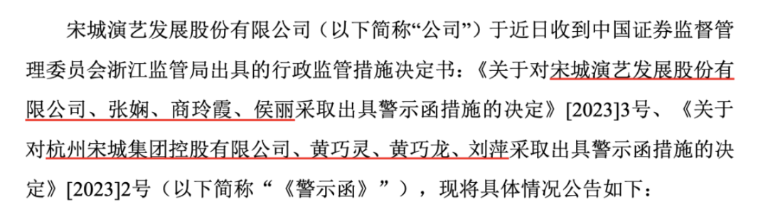 2023年1月, 宋城演艺 收到浙江证监局警示函,原因是未如实披露股权转让相关“差额补足义务及超额收益安排”具体内容,信息披露不完整。