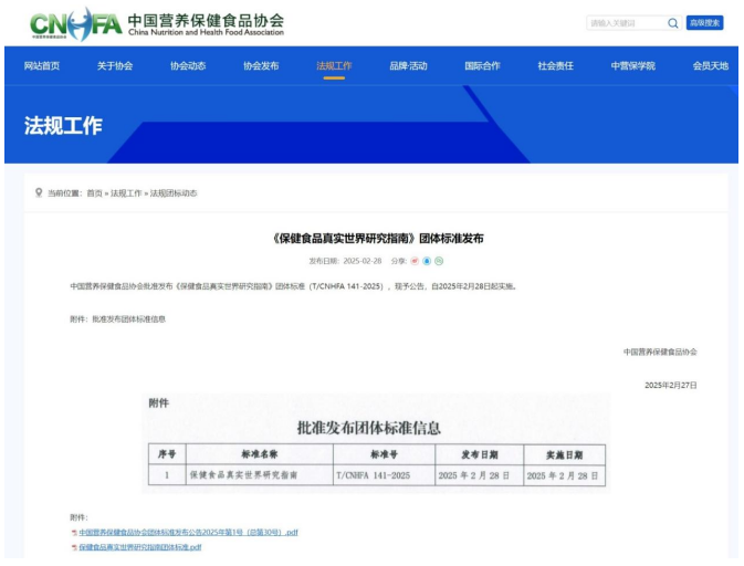 2月28日,中国营养保健食品协会正式发布行业首个真实世界研究标准——《保健食品真实世界研究指南》。这一标准由中山大学公共卫生学院、中国标准化研究院、中国营养保健食品协会保健食品研发专业委员会以及汤臣倍健主要牵头起草,历时3年制定而成。它参考了药品领域的真实世界研究体系,旨在为保健食品上市后的功能与安全性评价提供科学方法和技术指导,填补了行业在该领域的空白,开启了科学营养的循证新纪元。