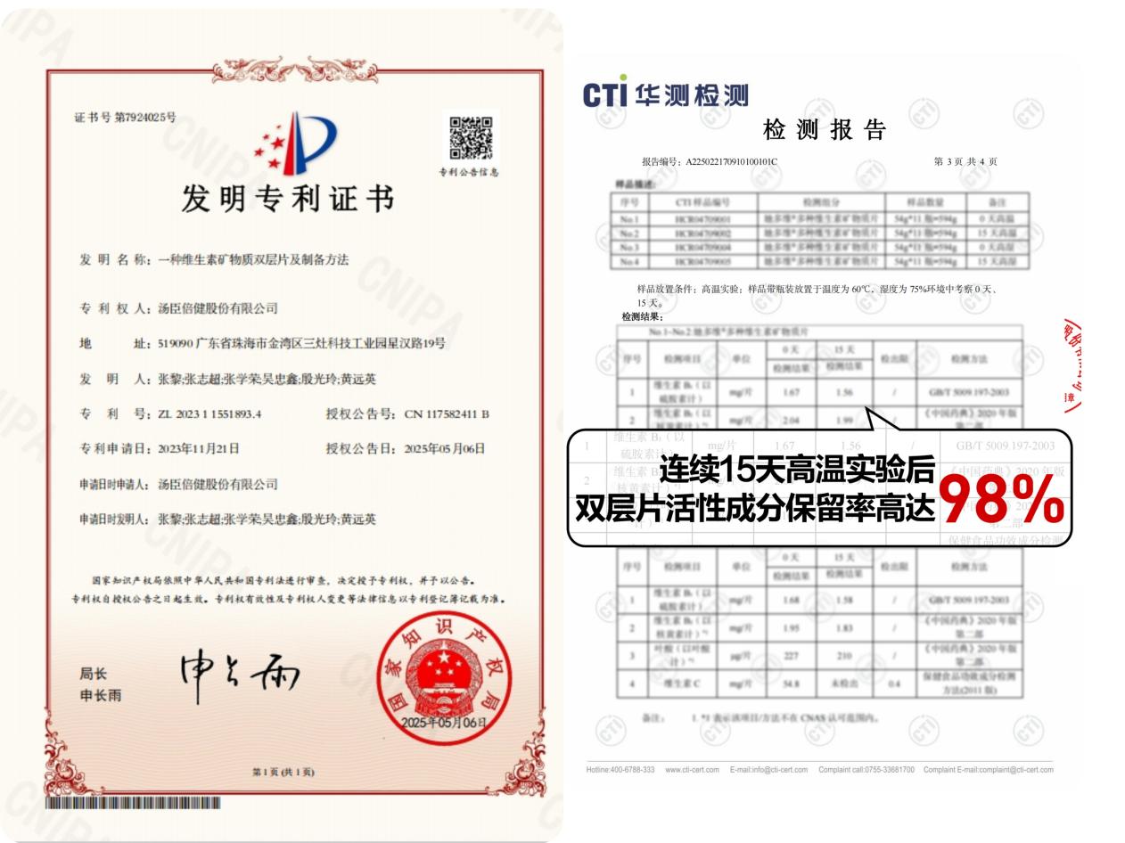 据第三方检测机构实证,片剂带瓶放置于温度为60℃、湿度为75%的环境下15天,汤臣倍健她多维双层片的活性成分维生素B2保留率最高可达98%;其中维生素B1保留率为93%[1],高于一般单层片维生素B1的24%-79%保留率[2]。