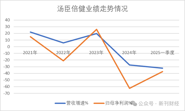 作为国内膳食营养补充剂行业龙头汤臣倍健,正在经历上市以来最显著的业绩滑坡。2024年年报显示,公司营收同比下滑27.30%至68.38亿元,归母净利润更是骤降62.62%至6.53亿元,这一数字仅为2021年巅峰时期的三分之一。进入2025年,颓势未止,一季度营收同比下滑32.29%,净利润跌幅达37.44%。