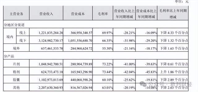 渠道表现方面,汤臣倍健各主要销售阵地均呈现不同程度的下滑态势。2024年,公司线上渠道实现营收12.22亿元,同比下滑28.21%,值得注意的是,其毛利率也同步下降4.33个百分点,反映出电商平台竞争加剧带来的价格压力。线下渠道作为传统主力,营收31.25亿元,但同比降幅达31.98%,超过线上渠道。此外,海外市场同样不容乐观,境外渠道营收6.37亿元,同比下降21.16%,毛利率也微降1.63个百分点。