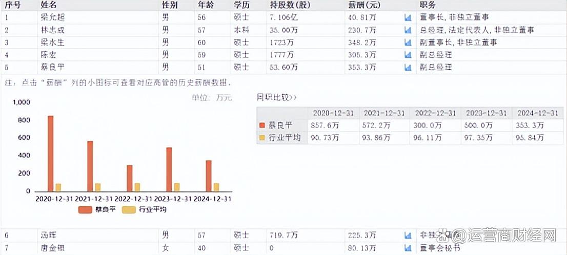 与此同时,公司高管薪酬也普遍下降,多位降幅过百万元。蔡良平2024年薪酬为353.3万元,相较于2023年的500.0万元,下降了146.7万元,但他的薪酬仍高于另一位副总经理陈宏。