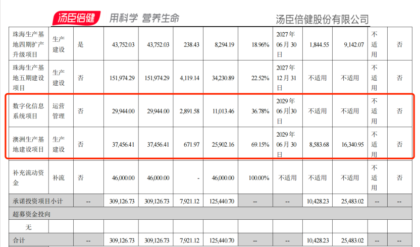 根据年报,汤臣倍健将“澳洲生产基地建设项目”与“数字化信息系统项目”两大关键工程达到预定可使用状态的日期,从2026年6月30日延期至2029年6月30日,整整推迟三年。
