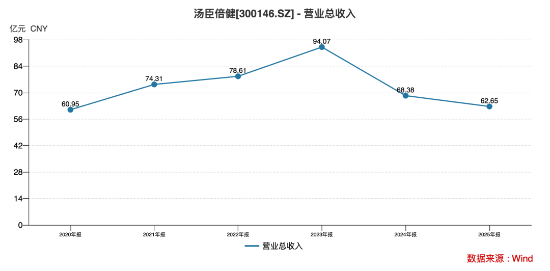 数据显示,2025年,汤臣倍健实现营业收入62.65亿元、净利润7.82亿元;而五年前的2020年,其营收早已达到了60.95亿元,2017年7.66亿元的净利润则与去年不相上下。