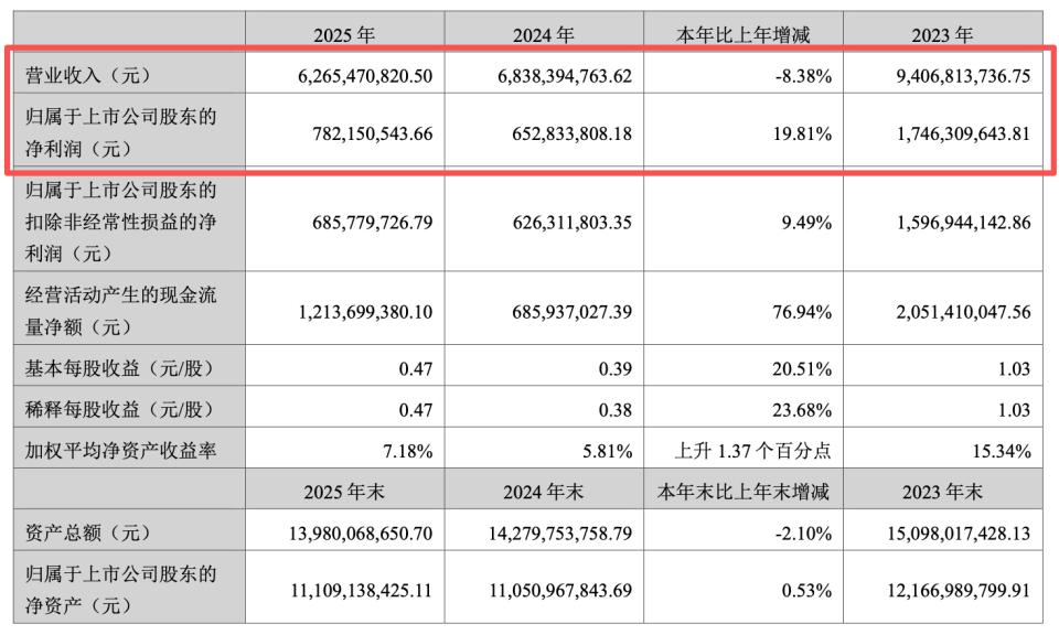 近日,汤臣倍健(300146.SZ)发布 2025 年度业绩报告。财报显示,公司全年营业收入 62.65 亿元,同比下滑 8.38%;归属于上市公司股东的净利润 7.82 亿元,同比增长 19.81%。营收利润"一降一升",构成了这家中国最大膳食营养补充剂企业,过去一年的业绩底色。