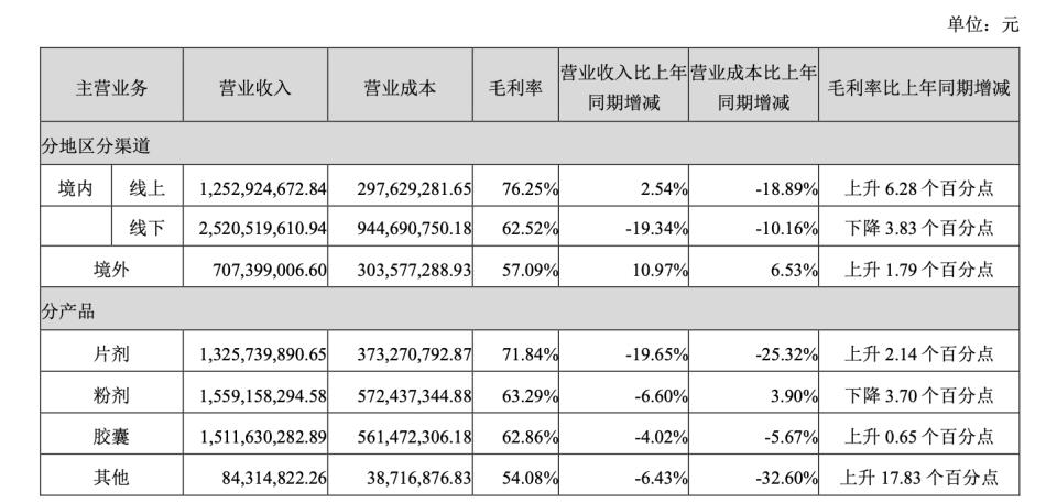 渠道端的压力,在数据上有更具体的呈现。长期以来,药店与商超是汤臣倍健最重要的收入来源,线下渠道占比在 2022 年曾达境内收入的 61.14%。