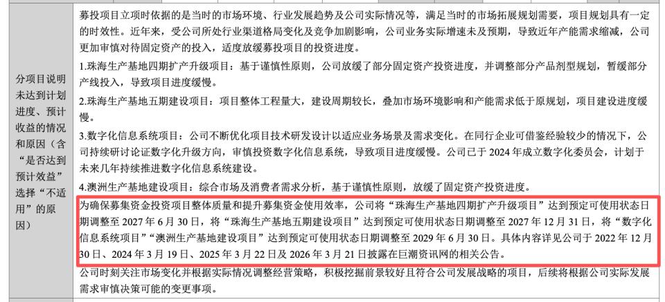 与此同时,两大核心募投项目,同步宣告延期:原定 2026 年 6 月完工的"数字化信息系统项目"与"澳洲生产基地建设项目",均推迟至 2029 年 6 月,整整延后三年,截至年报披露日投资进度分别为 36.78%和 69.15%。