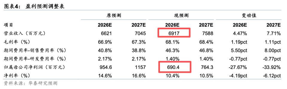据华泰证券预测,汤臣倍健 2026 年营收约 69.17 亿元,但归母净利润约 6.9 亿元,较 2025 年实际值下降约 11.8%。