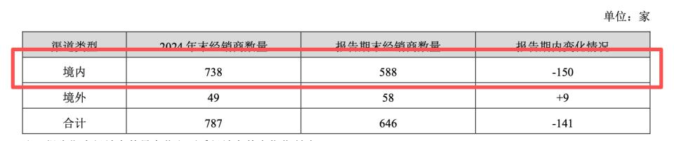 与此同时,境内经销商数量从 2024 年的 738 家降至 588 家,减少 150 家,降幅超过两成。