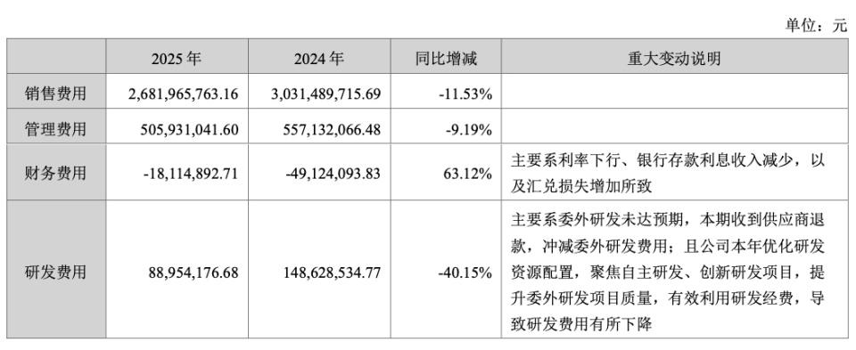 答案藏在费用端。2025 年,汤臣倍健三项核心费用全面压缩:销售费用从 30.31 亿元降至 26.82 亿元,同比下降 11.53%;管理费用从 5.57 亿元降至 5.06 亿元,同比下降 9.19%;研发费用则从 1.49 亿元骤降至 8895 万元,同比下跌 40.15%。