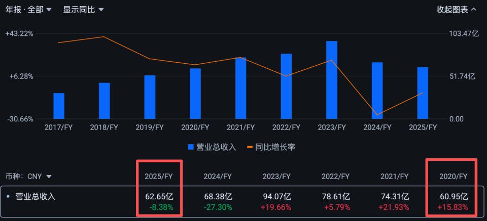 拉长时间轴看,62.65 亿元的营收规模,已回落至 2020 年水平(彼时全年收入为 60.95 亿元);7.82 亿元的净利润,也不过与 2017 年的 7.66 亿元,基本持平。