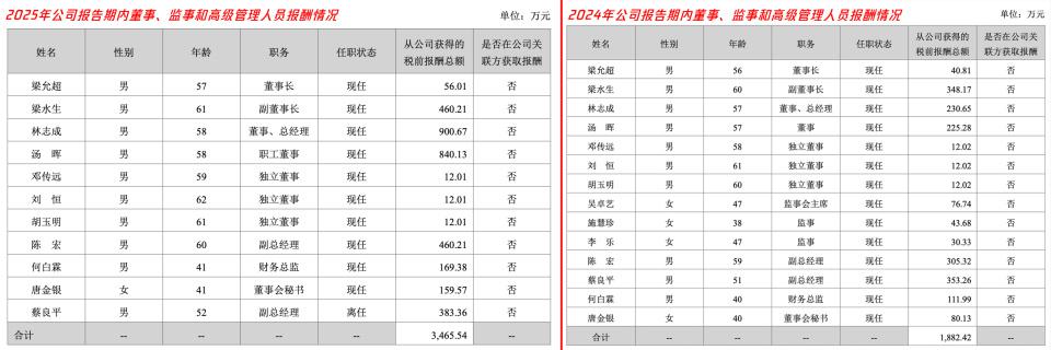 董事长梁允超本人薪酬相对较低,从 40.81 万元升至 56.01 万元,同比增长约 37%。