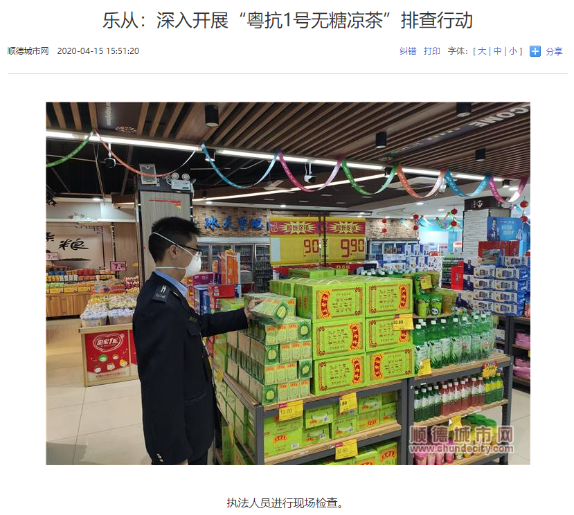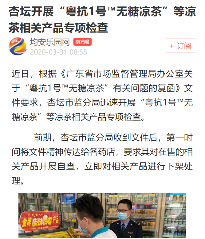 不过,“粤抗1号”凉茶推出没多久,就有了被“专项检查”和“产品下架”的报道。