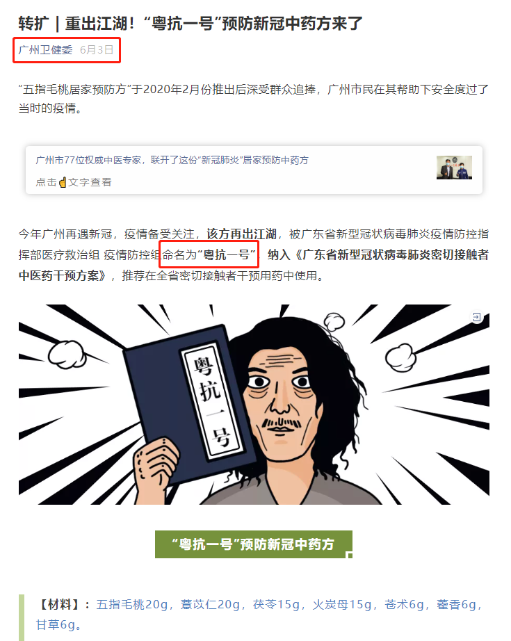 今年6月3日,广州卫健委再次发文推荐“粤抗一号”,用于密切接触者干预。称“经过一年的实践,证明该方适用于岭南地域气候特点、广东人群体质和本地病例临床特点”。