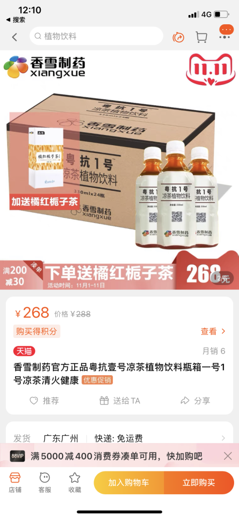 图片说明:香雪制药天猫旗舰店“粤抗1号”凉茶销售页面截图
