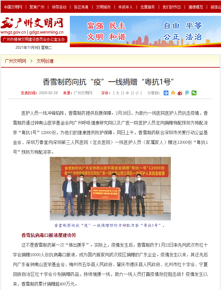 更有报道称,发布会前一天,香雪制药通过钟南山医学基金会向广州呼吸健康研究院以及广医一院医护人员定向捐赠“粤抗1号”凉茶12000份,为他们的健康提供防护保障。