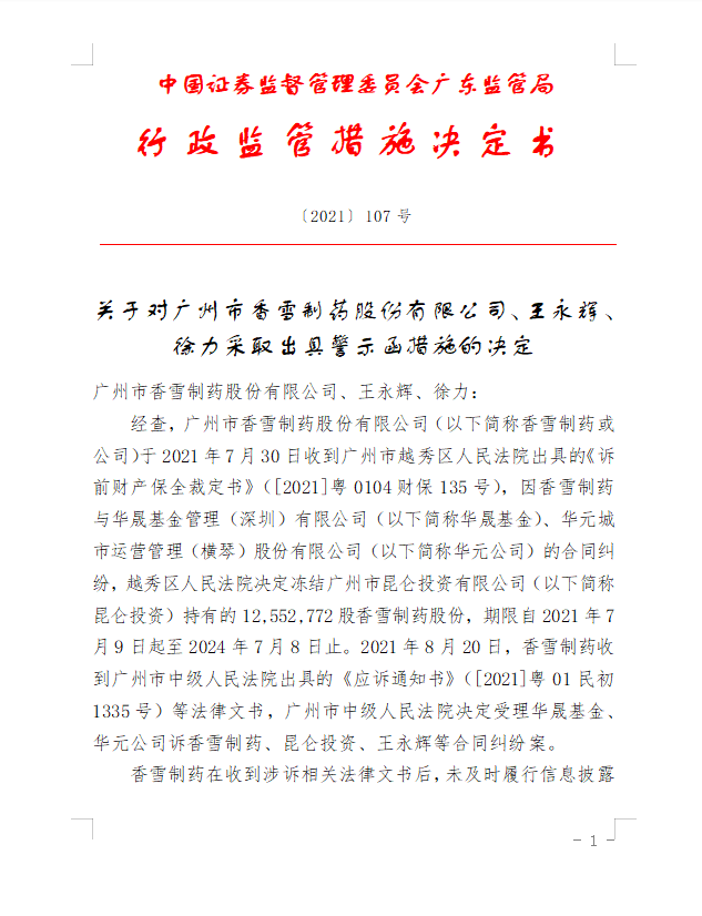 决定书显示,因香雪制药未能及时、依规披露广州市中级人民法院决定受理华晟基金、华元公司诉香雪制药、昆仑投资、王永辉等合同纠纷案,将对香雪制药、王永辉、徐力采取出具警示函的行政监管措施。