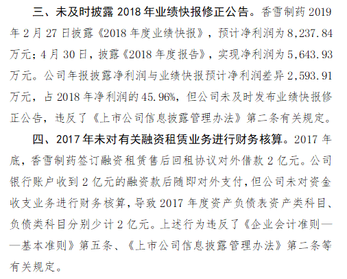 本次警示函还提到,香雪制药2019年2月27日披露《2018年度业绩快报》,预计净利润为0.82亿元;4月30日,披露《2018年年度报告》,实现净利润为0.56亿元。公司年报披露净利润与业绩快报预计净利润差异0.25亿元,占2018年净利润的45.96%,但公司并未及时发布业绩快报修正公告。