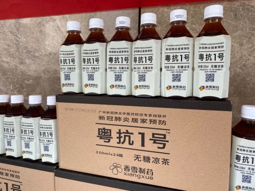 图片说明:“粤抗1号”凉茶瓶身及纸箱上,标有“新冠肺炎居家预防”字样。图据信息时报