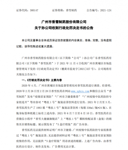 行政处罚决定书显示,2020年2月26日至2月28日,香雪医药在网站和微信公众号“香雪制药”发布“疫情居家预防”、“广州市卫健委推荐”、“广州疫情中医药防控专家组连开”等内容,对“粤抗1号”瓶装凉茶饮料进行宣传。