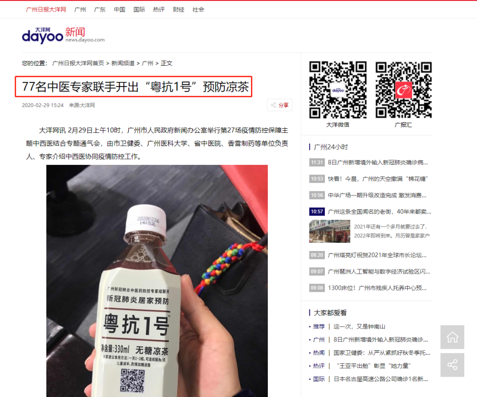 图片说明:香雪制药推出“粤抗1号”凉茶的相关新闻报道