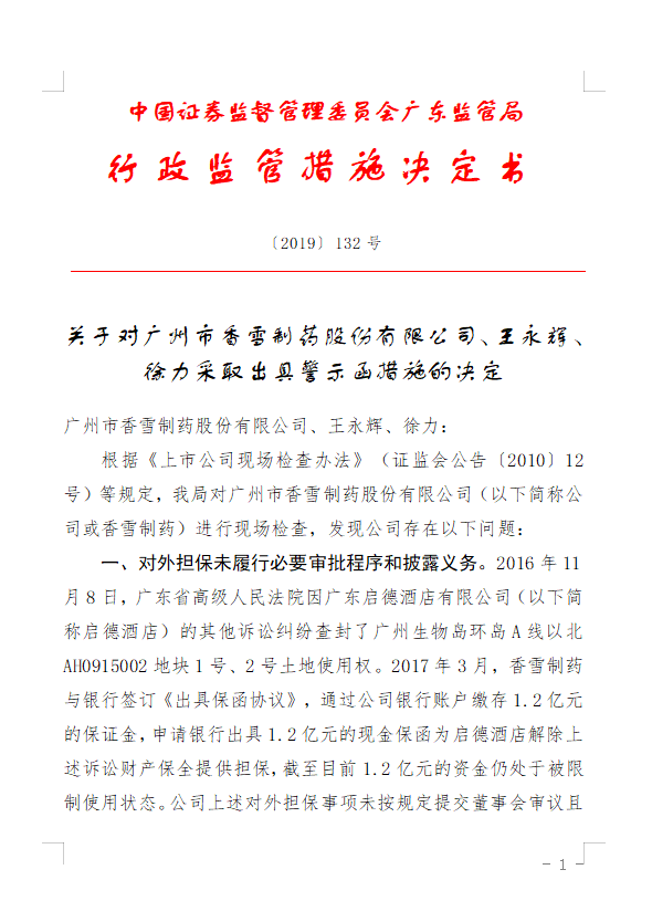 2020年1月,因对外担保未履行必要审批程序和披露义务、内幕信息登记管理存在问题等,香雪制药及相关当事人收到来自证监会广东监管局下发的警示函。