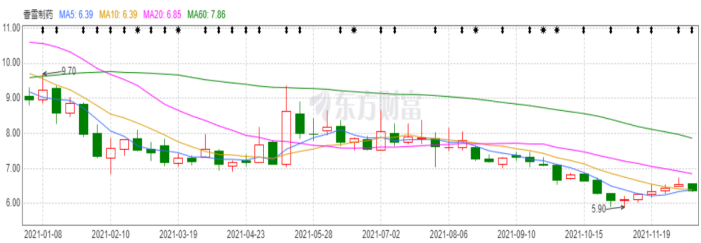 由于股东的不断减持,香雪制药的二级市场也低迷不止。今年1月,其股价最高还在9.7元/股,而到今年11月,其股价最低曾触及5.9元/股,跌幅达到64.4%。