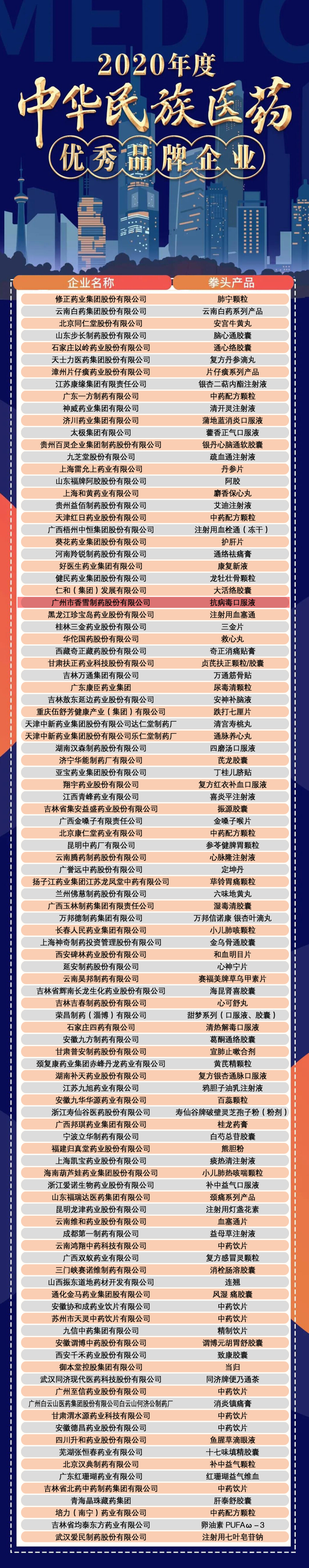 该榜单由全国工商联医药业商会通过企业申报、地方工商联推荐、各专业分会信息汇总以及网络数据分析等途径,经过秘书处统计整理,综合市场销售额、行业占比、品牌认知、科技创新、国际化程度以及企业专精特新的特点等因素,报评审委员会评选出“2020 年度中华民族医药优秀品牌企业”。