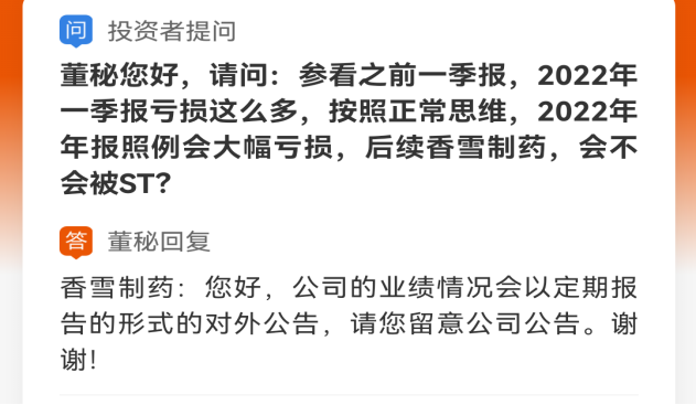 与此同时,投资者还质疑公司目前大幅亏损是否会被“ST”。