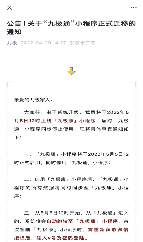 记者发现,2022年4月29日,九极生物旗下的公众号九极发布消息显示,售卖该饮料的小程序平台九极通已经停用,目前全部数据已经转移至九极康。而在九极康小程序上,目前该产品仍在售卖,但在详情页面没有了这些夸大的宣传语。