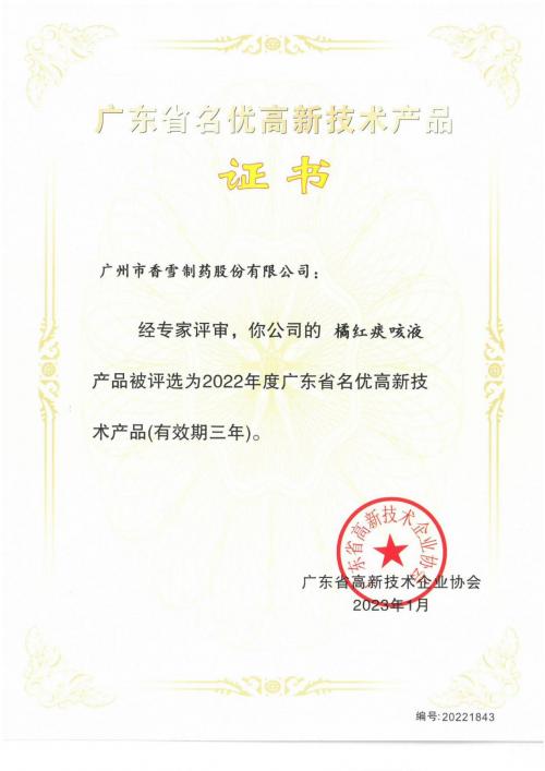 近日,广东省高新技术企业协会公布“2022年广东省名优高新技术产品名单”,其中,香雪制药橘红痰咳液、化橘红饮片、基于新技术生产的高质量中药配方颗粒上榜,4月11日,香雪制药取得广东省名优高新技术产品证书。此荣誉是对香雪制药技术创新和产品研发成果转化能力的充分认可和肯定。