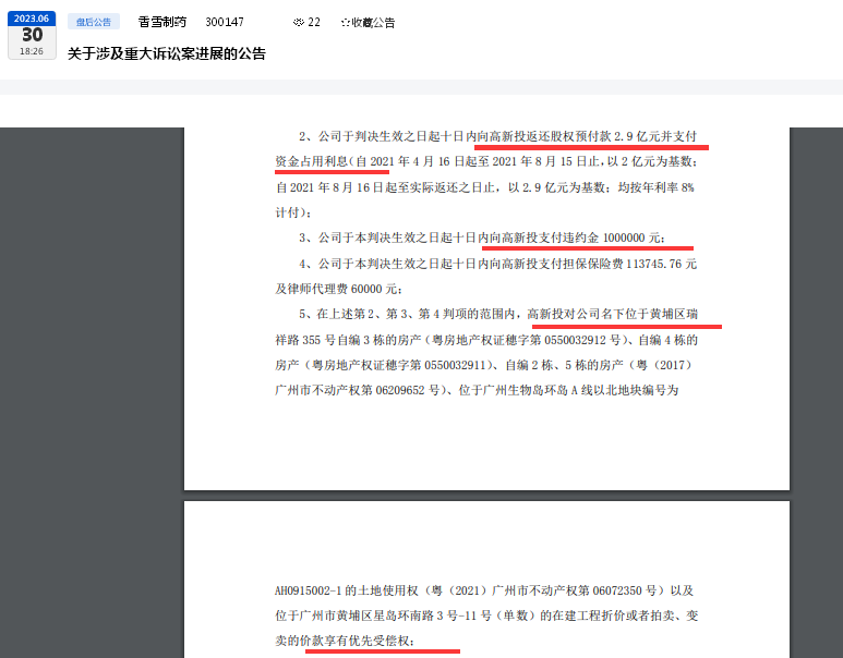 同日,即6月30日,香雪制药披露《关于涉及重大诉讼案进展的公告》。该公告显示,有关香雪制药与广州高新区投资集团有限公司因股权转让纠纷的诉讼事项,近日公司收到了广州市黄埔区人民法院出具的《民事判决书》(2022)粤 0112 民初 21858 号。