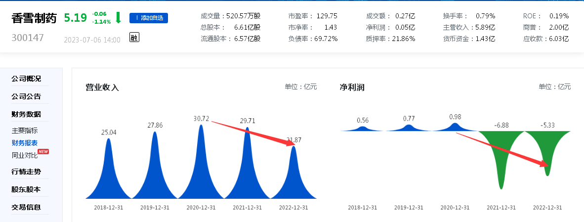 公开数据显示,最近五年,即2018年—2022年,香雪制药的净利润分别为0.56亿元、0.77亿元、0.98亿元、-6.88亿元、-5.33亿元。即最近两年持续巨额亏损,合计亏损12.21亿元。